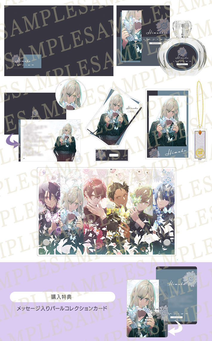 キャラクターの香りをイメージした「香水」に加えて、描き下ろしイラストを使用した「缶バッジ、カード型アクリルスタンド、アクリルカード」と、書き下ろしメッセージの入った「メッセージカード」、「ボトルチャーム」がセットになったフレグランスBOXにアクリルパネルが付属しています。