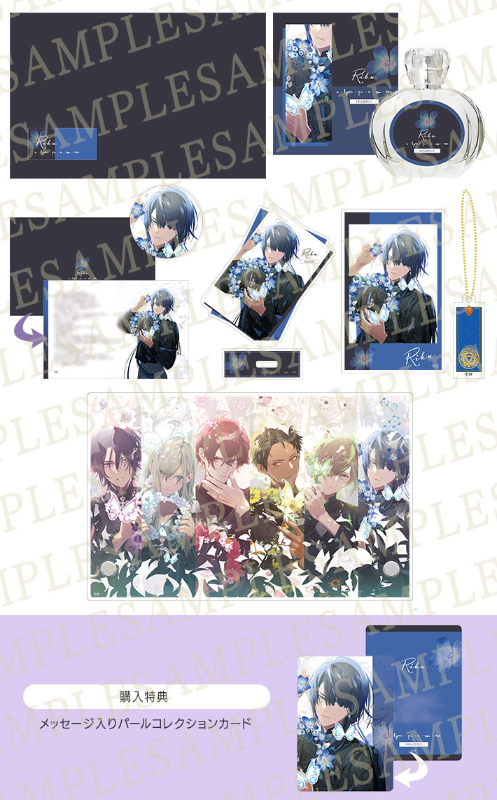 キャラクターの香りをイメージした「香水」に加えて、描き下ろしイラストを使用した「缶バッジ、カード型アクリルスタンド、アクリルカード」と、書き下ろしメッセージの入った「メッセージカード」、「ボトルチャーム」がセットになったフレグランスBOXにアクリルパネルが付属しています。