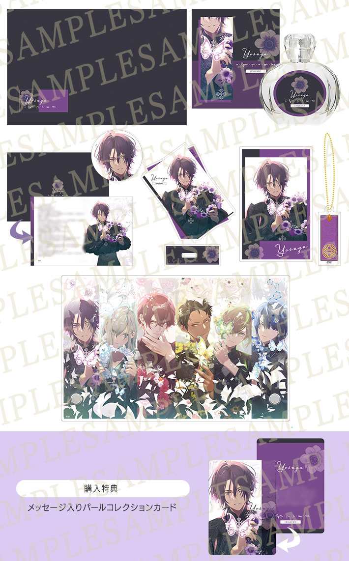 キャラクターの香りをイメージした「香水」に加えて、描き下ろしイラストを使用した「缶バッジ、カード型アクリルスタンド、アクリルカード」と、書き下ろしメッセージの入った「メッセージカード」、「ボトルチャーム」がセットになったフレグランスBOXにアクリルパネルが付属しています。