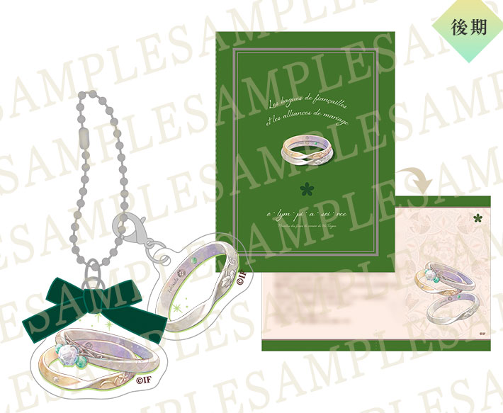 オランピアをイメージした婚約指輪と、2本が対になる結婚指輪をモチーフとしたキーホルダーです。彼の指輪チャームは取り外して使用することも可能です。