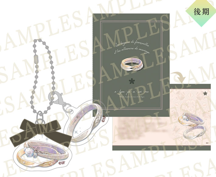 オランピアをイメージした婚約指輪と、2本が対になる結婚指輪をモチーフとしたキーホルダーです。彼の指輪チャームは取り外して使用することも可能です。