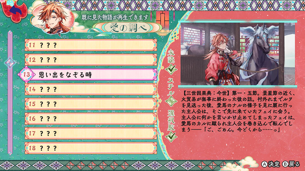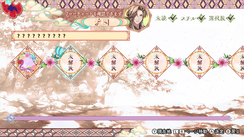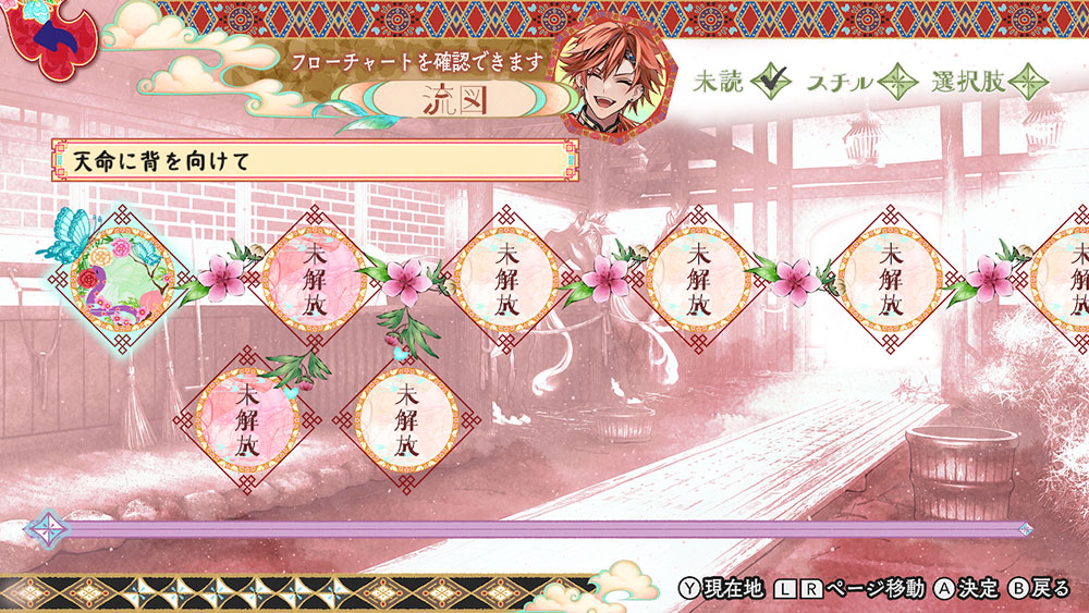 金烏玉兎典/天命胤外伝では、物語の進行状況をフローチャート形式で確認することができます。