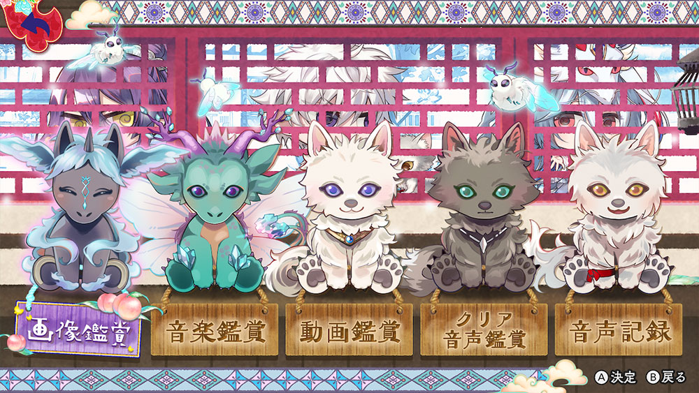 ゲーム中に見たスチルの鑑賞、BGMの視聴、ムービーの視聴、クリア音声の視聴、音声記録をお楽しみいただくことができます。