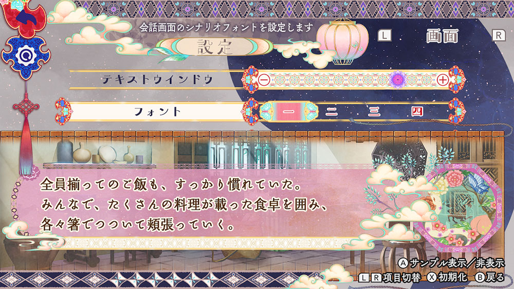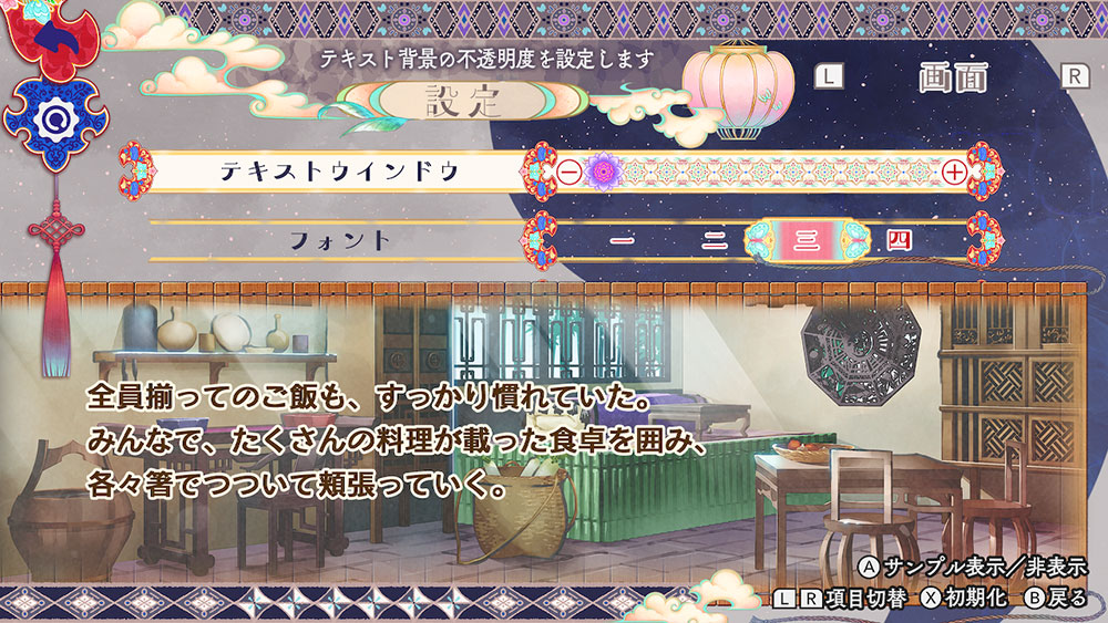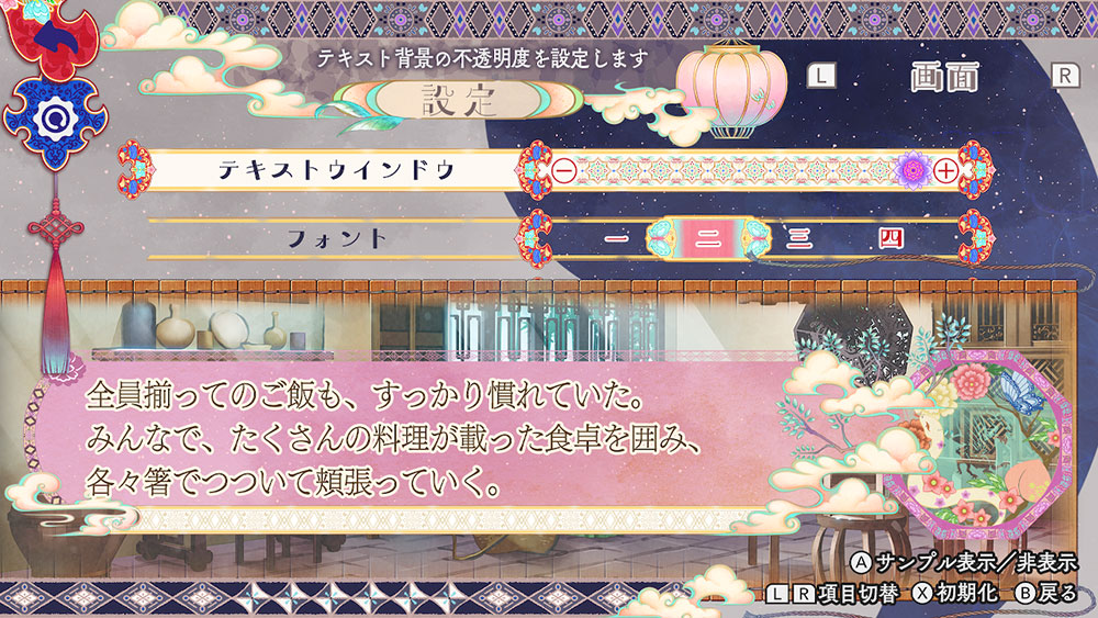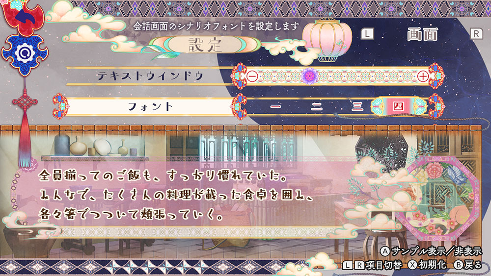 設定の画面設定では、テキストウィンドウの濃淡を変更したり、フォントを4種類の中から選べたりと、お好みのテキストでお楽しみ頂けます。