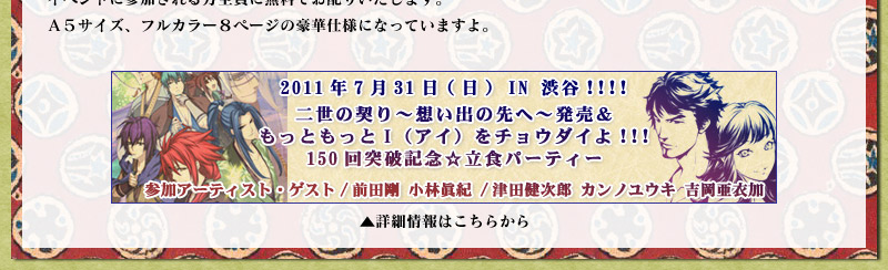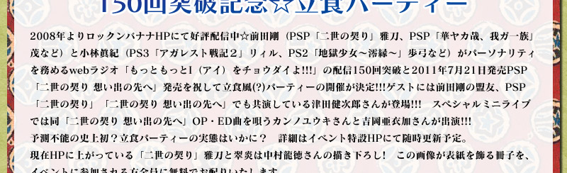 | イベント名 | :『二世の契り 想い出の先へ』発売&『もっともっとアイをI(アイ)をチョウダイよ!!!』150回突破記念☆立食パーティー |