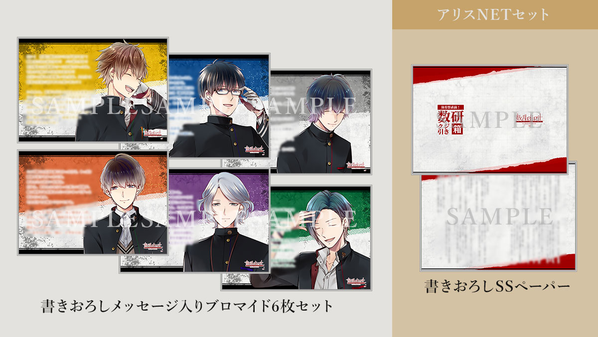 - 書きおろしメッセージ入りブロマイド6枚セット ▷書きおろしキャラクター:弐藤 光、壱園 央助、肆形 有比、漆原 景太郎、陸平 崇樹、玖折 巡